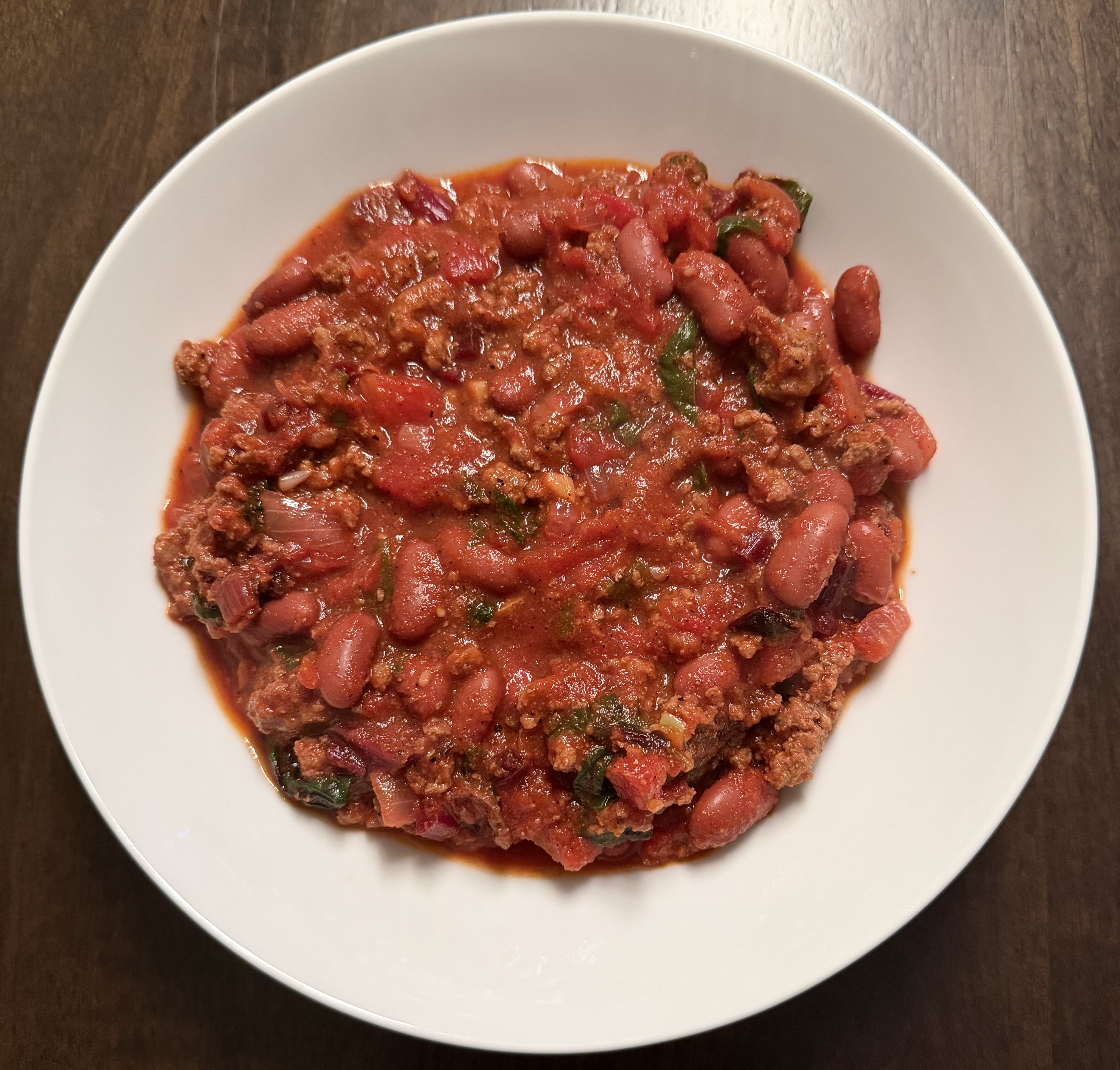 - Variation: Chili made with 1 can kidney beans, two cups cooked chicken and 4 cups of spinach and arugula mix.